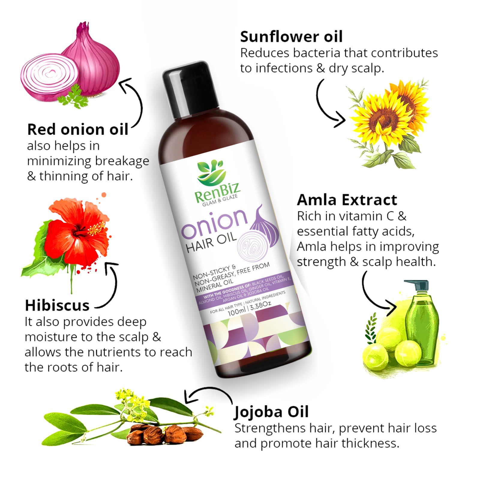 ADDS STRENGTH & SHINE: Full of nature’s goodness, a blend of nourishing oils such as Sunflower Oil, Amla Oil, Hibiscus Oil, etc. our Onion Oil makes hair strong from the inside & shinier on the outside.