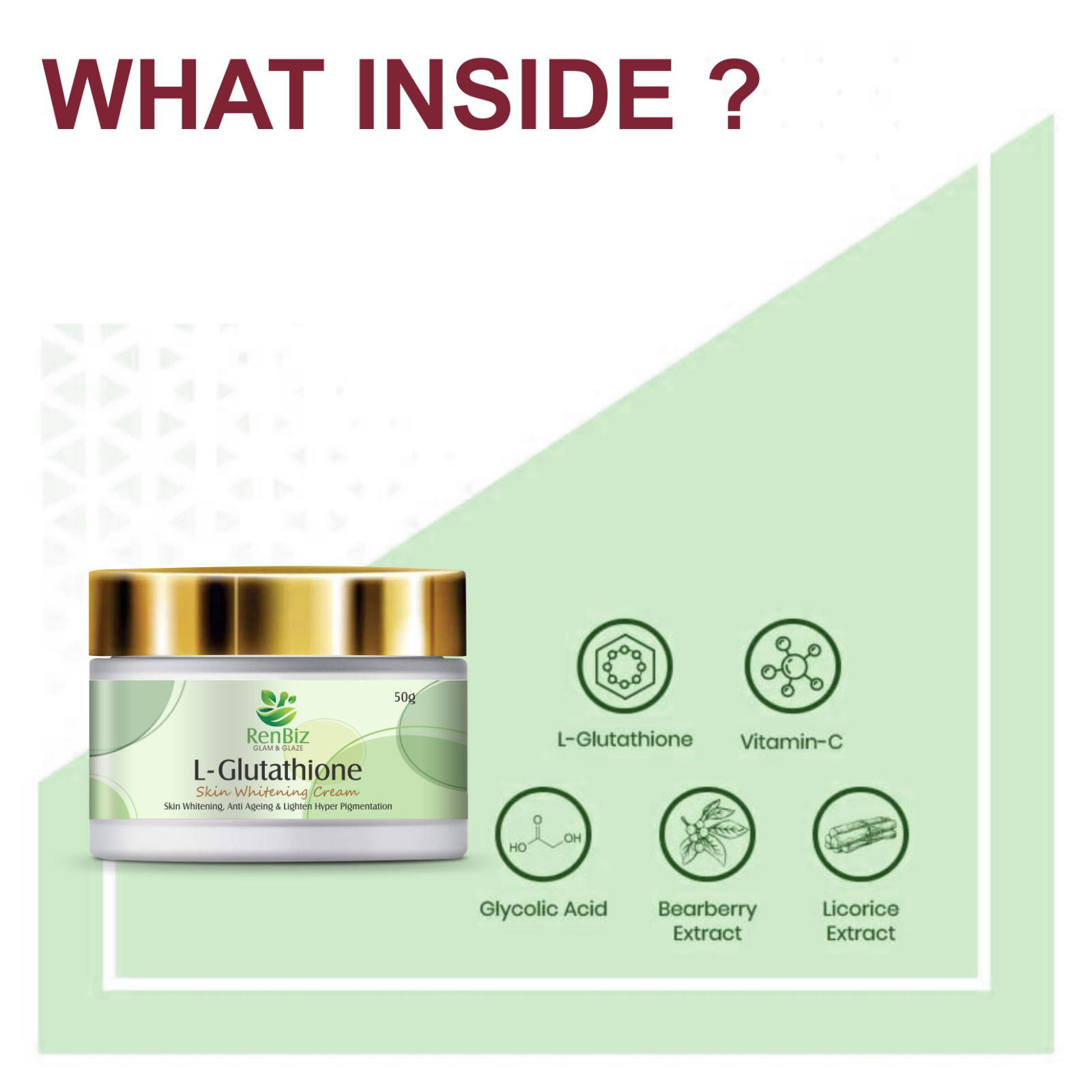 L- Glutathione Day & Night Cream – is formulated with L- Glutathione , Vitamin-C, Vitamin E and other ingredients like Shea Butter , Glycolic Acid, bearberry which prevent damage from UV rays, regenerate and repair tissues , lighten hyperpigmentation, dark spots, age spots and melasma. It also boosts skin Collagen production that gives you firmer more plump skin and helps to protect skin’s natural oils , treats acne, fine lines, wrinkles, dullness and gives you whiter , brighter skin and Glass skin tone making it look younger.